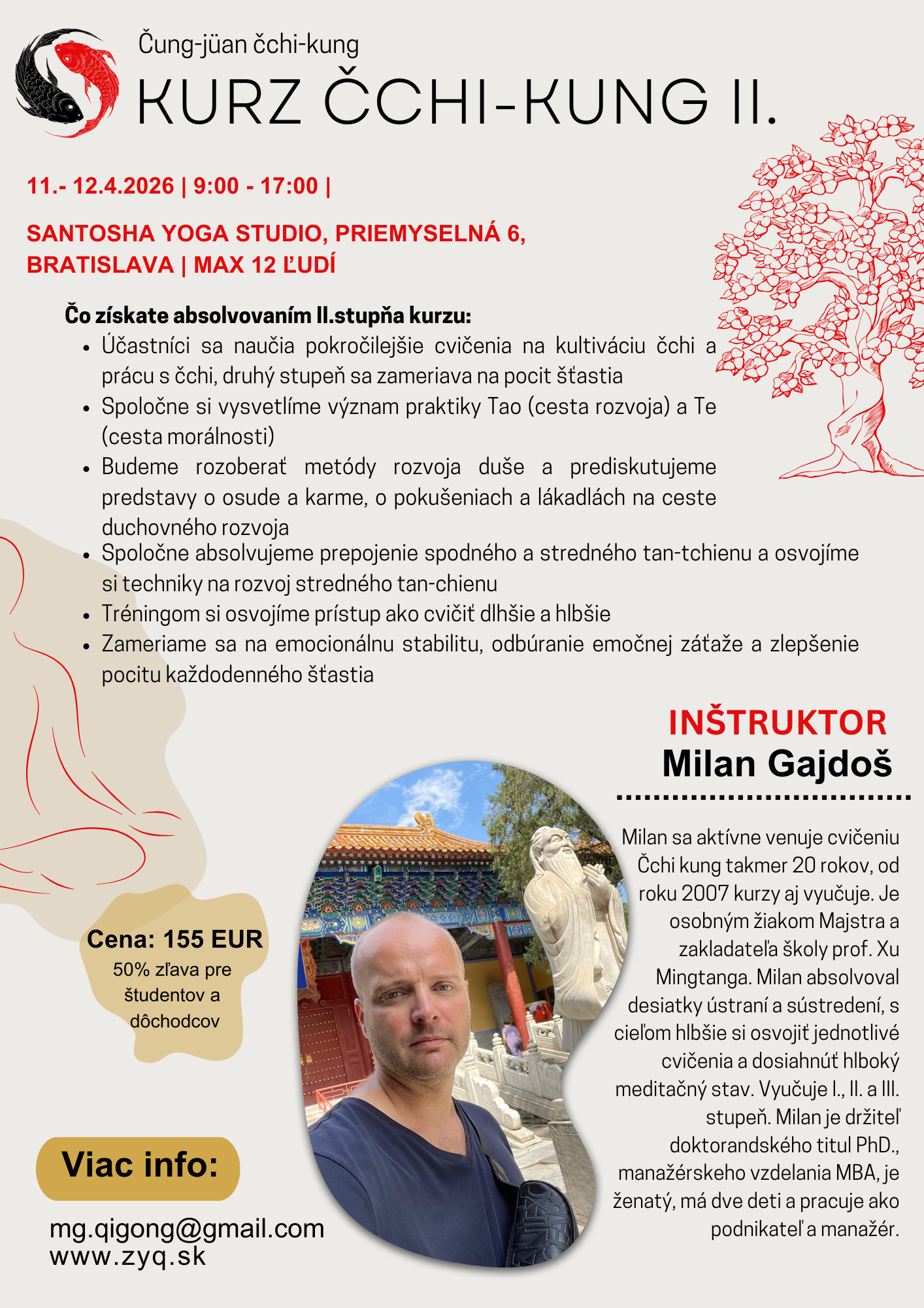 Rád by som vás pozval na kurz II. stupňa, ktorý sa uskutoční v Bratislave, cez víkend 11.4 a 12.4.2026. Pre prihlásenie a v prípade otázok ma prosím kontaktovať emailom – mg.qigong@gmail.com alebo telefonicky – 0907 730 423. Ďakujem, Milan